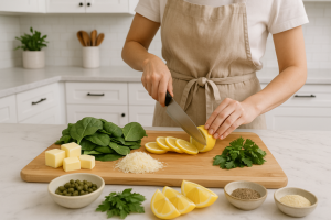 Ingredients: Chicken breast, broccoli, chicken broth, baby spinach, fresh lemon juice, butter, parmesan cheese, honey, capers, honey, salt, lemon zest, parsley, minced garlic, onion powder, dry oregano, garlic powder, lemon and pepper seasoning.